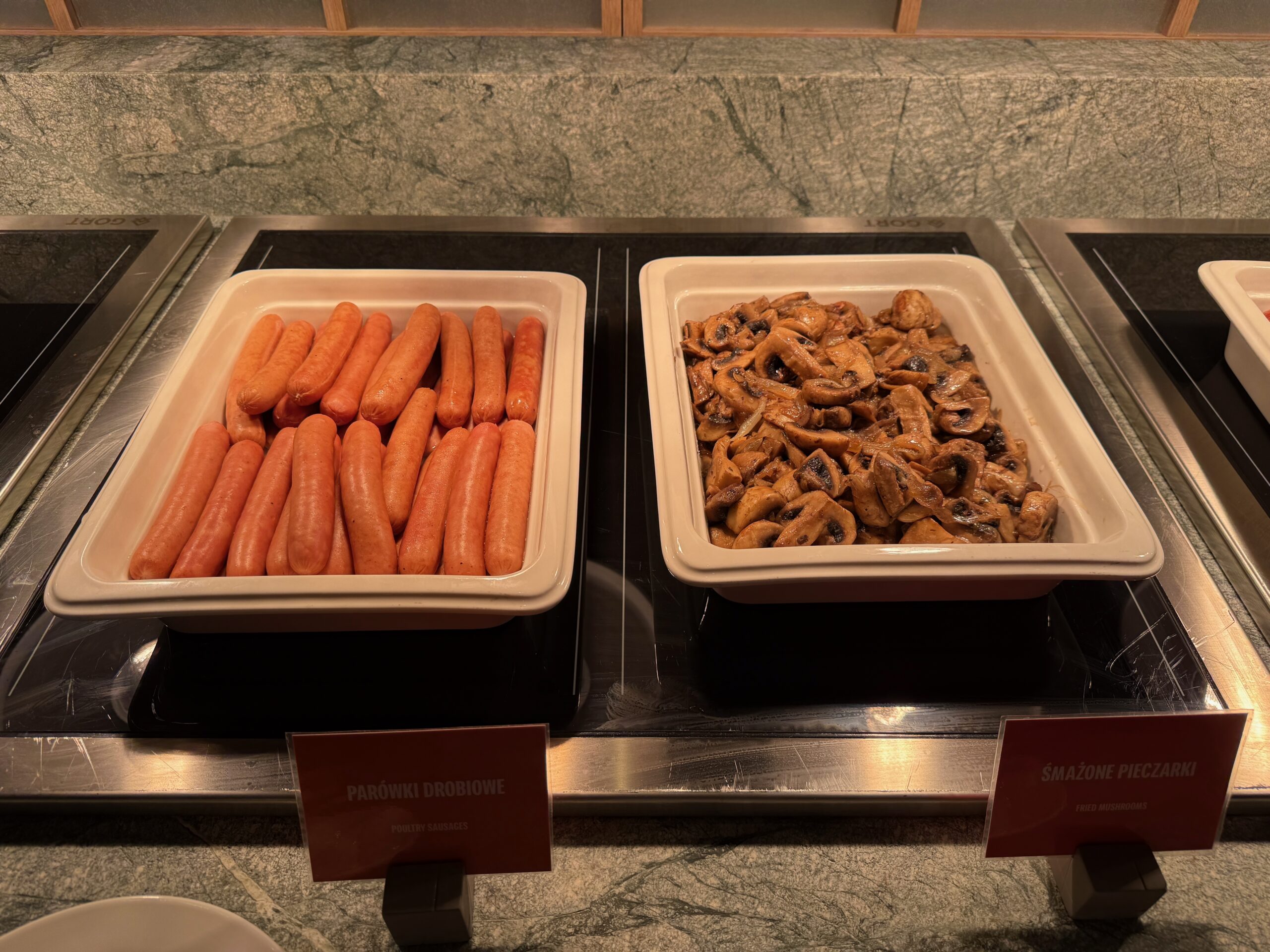 Hampton by Hilton Wrocław Airport – śniadanie – bufet – smażone pieczarki, parówki drobiowe
