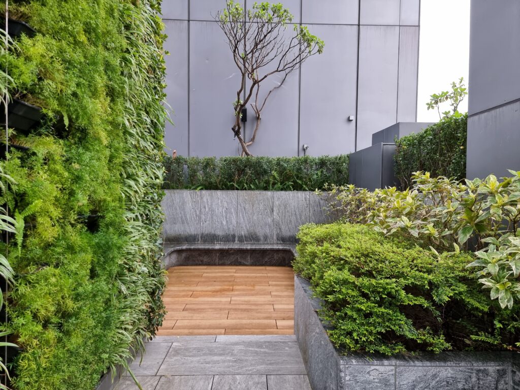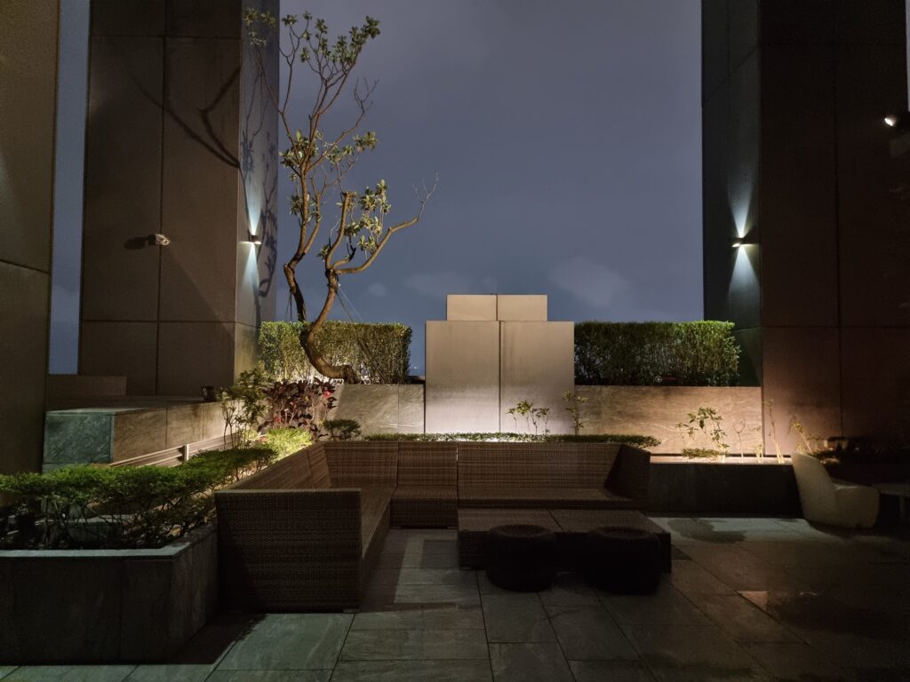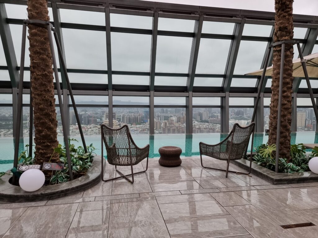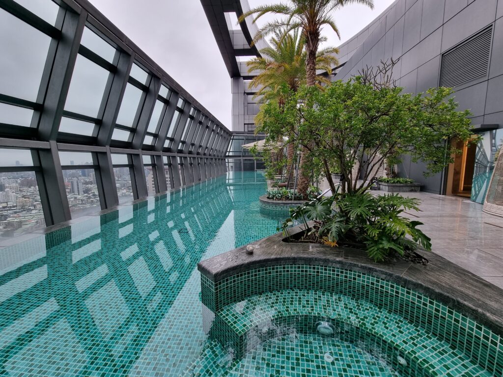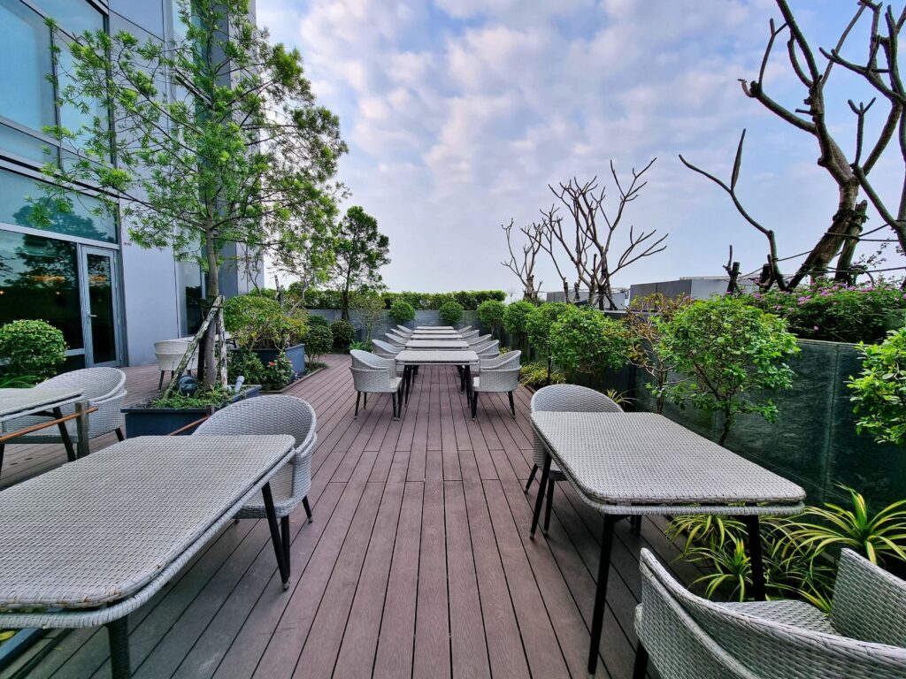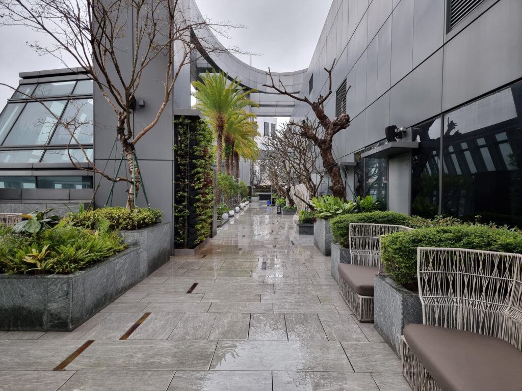 Niejako „przy okazji” – ze względu na formę i kształt budynku hotelu, oferuje on swoim gościom możliwość spędzenia czasu na tarasie na trzydziestym drugim piętrze, na którym znajduje się między innymi basen. Miejsce to jest jednak znacznie większe i bardziej rozbudowane i daje gościom dostęp do świeżego powietrza i zarazem dachu nad głową w nieco spokojniejszej atmosferze niż ma to miejsce na poziomie lobby. Dodatkowo spora ilość zieleni, widoki na miasto, oraz gustownie zaaranżowane miejsca siedzące w różnych zestawieniach powodują, że zarówno podczas dnia, jak i wieczorem jest to doskonały punkt, w którym można zażyć świeżego powietrza, spotkać się ze znajomymi, czy po prostu przyjść odetchnąć, zmieniając otoczenie.