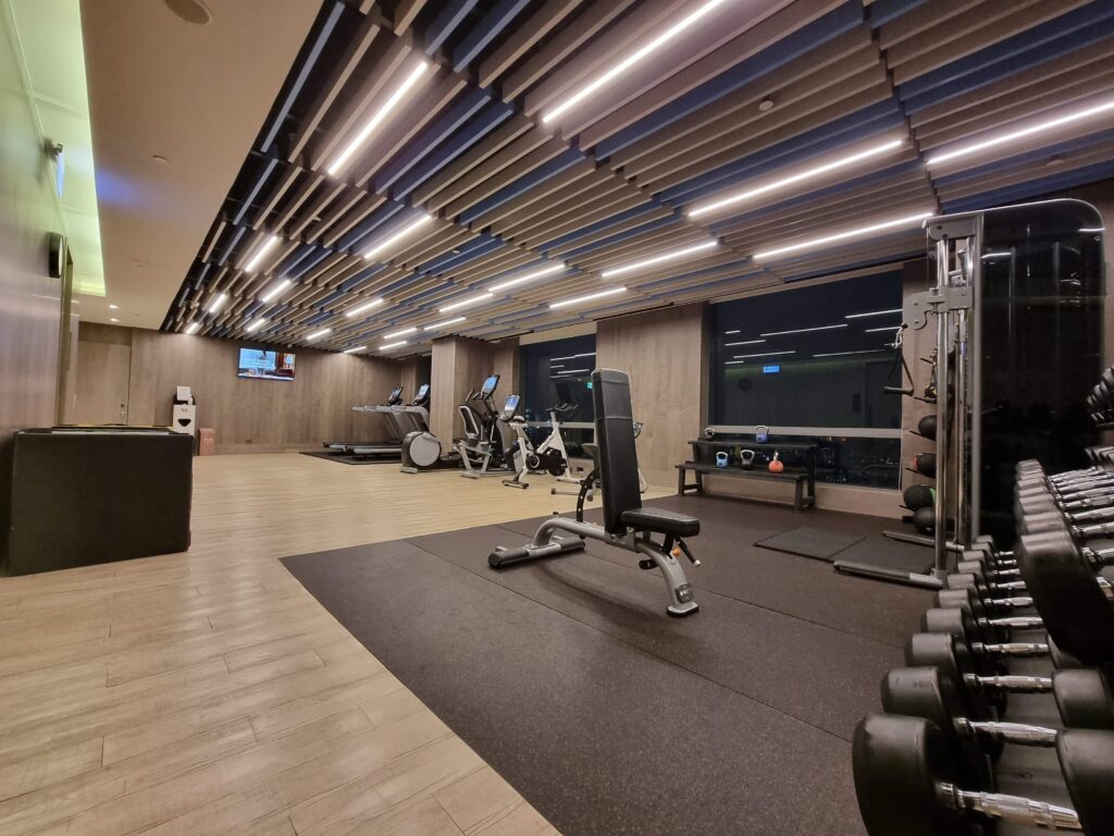 Goście mogą też skorzystać z wydzielonej, znajdującej się na tym samym poziomie co basen i taras strefy sportowej, gdzie do ich dyspozycji oddano przestrzeń dedykowaną ćwiczeniom z odpowiednim sprzętem i wyposażeniem. Jest tu sporo miejsca, woda, ręczniki. Wszystkie elementy pozostawały czyste i sprawne podczas całego naszego pobytu.