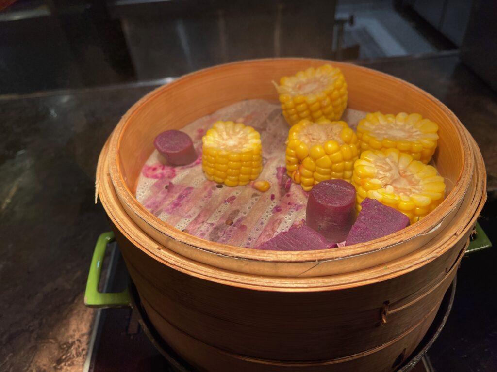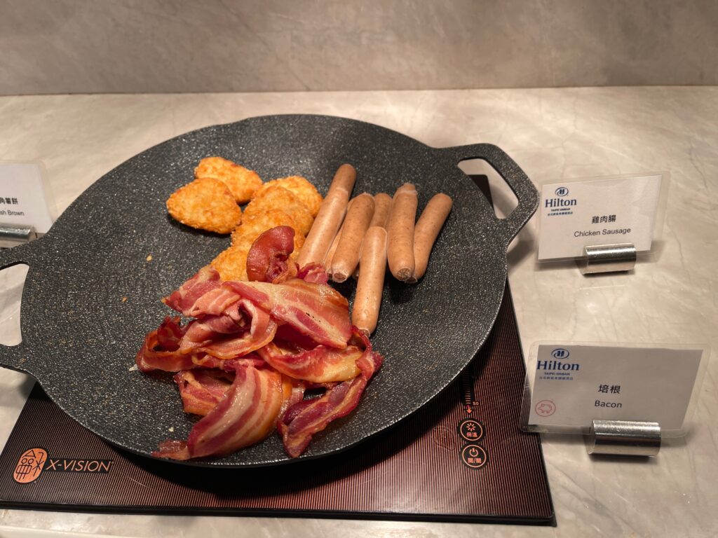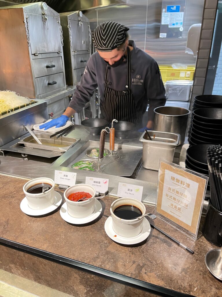 Hilton Taipei Sinban oferuje w czasie pierwszego posiłku dnia bardzo szeroki wybór dań, w tym kilka pozycji przygotowywanych na odpowiednich stanowiskach zgodnie z życzeniami gości na ich zamówienie.