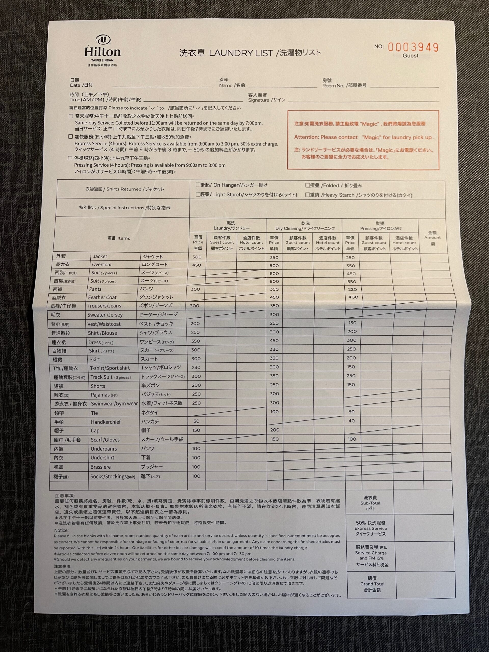 Hilton Taipei Sinban – 2817 King guest room – cennik prania